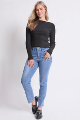 Women's High Rise Basic 5 Pocket Straight Leg Jeans from Royalty For Me, where classic style meets modern comfort. These jeans are designed to offer a flattering high-rise silhouette paired with a straight leg fit, making them a versatile addition to any wardrobe.