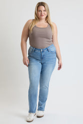 Enhance your natural shape with the Women's Plus WannaBettaButt Straight Leg Jeans. Featuring a heart-shaped yoke on the back, these jeans are designed to accentuate and lift your curves for a flattering fit. The straight leg cut offers a balanced silhouette, providing a comfortable yet stylish option that pairs well with any top. Made from soft, stretch denim, these jeans offer both flexibility and all-day comfort, making them a versatile addition to your closet for any occasion.