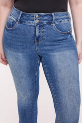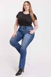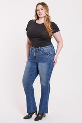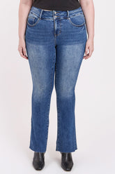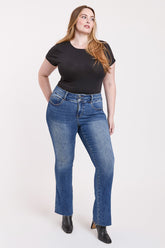 The Women's Plus Premium Stretch High Rise Bootcut Jeans offer a flattering fit with a touch of stretch for all-day comfort. Designed with a high-rise waist and a classic bootcut leg, these jeans provide a timeless look that pairs effortlessly with any outfit. The five-pocket design, along with a secure zipper and button fly, adds both function and style. Made from a premium fabric blend, they deliver the structured feel of denim with just the right amount of flexibility. Perfect for dressing up or keeping it casual, these jeans are a must-have staple.