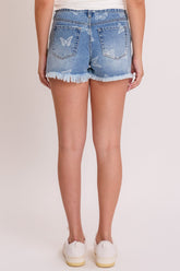 These mid-rise shorts feature a vibrant butterfly print that adds a whimsical charm, while the 5-pocket design offers practicality and classic appeal. The frayed hem adds a trendy, lived-in look for that casual, relaxed vibe.