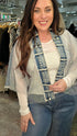 This piece is a TOTAL showstopper. It’s got that perfect mix of casual denim + all-over sparkle rhinestone mesh, so you can dress it up or down without even trying. The flowy poncho fit gives you that effortless drape, while the denim trim adds structure and edge.