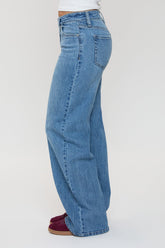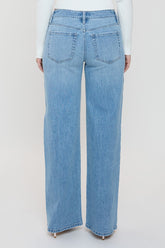 Step up your denim game with the Women’s Luxe Bella Asymmetrical Wide Leg Jeans. Designed with a relaxed rise waist and an eye-catching asymmetrical button and zipper fly, this pair brings a modern twist to a classic wide-leg fit.