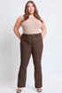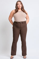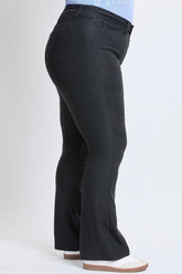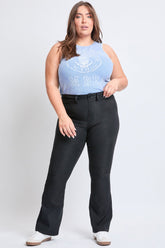 Be an absolute showstopper in our Junior Plus Size Hyperstretch Forever Color High-Rise Flare Pants. Designed with a slim fit through the thigh, this pant flares from knee to ankle for an ultra-flattering, leggy look. Featuring a five-pocket construction with false front pockets, a single-button closure with front zip, and belt loops. This fabric has been improved for greater color fastness, making it withstand more wear and washes. This is why we named this pant "Forever Color": it will be forever yours. Style with a fitted crop and boots for a groovy vibe!
