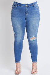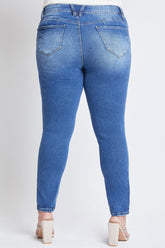 Our most popular skinny jean just got better! Our Women's Plus WannaBettaButt 1-Button Mid-Rise Regular Hem Skinny Jean Made with Recycled Fibers not only looks and feels good, but is good for the environment too! Designed with our signature WBB heart-shaped stitching and unique pocket shape to help enhance your curves and achieve a flattering, firmer look. Engineered with built-in panels and special construction at the waistline for perfect tummy control. Dress these up with heels and a blouse, or dress down with sneakers and a tee. With the versatility of these jeans, the styling options are endless!
